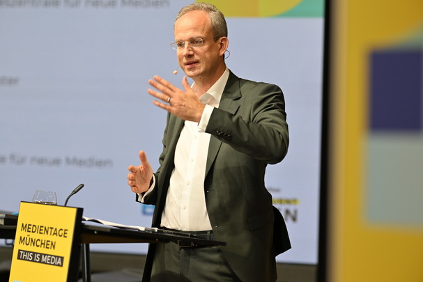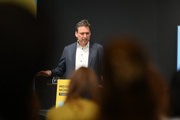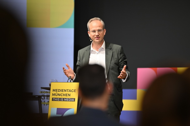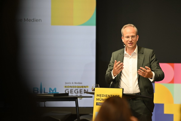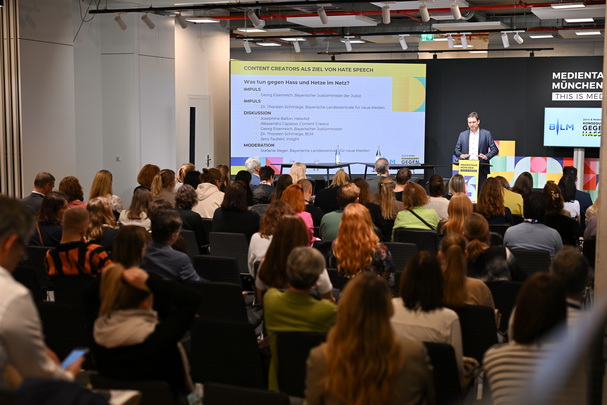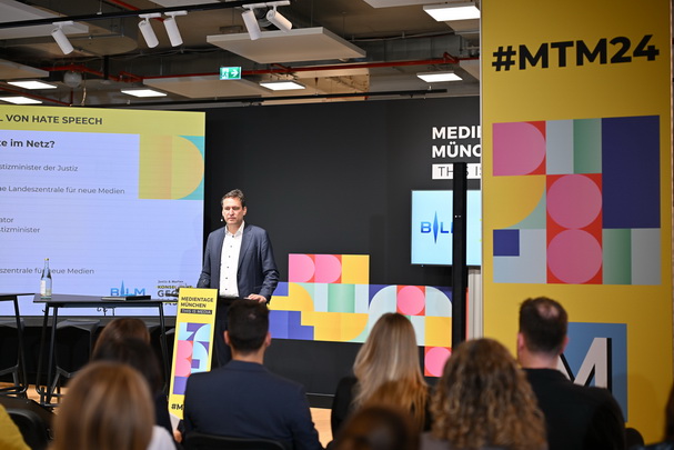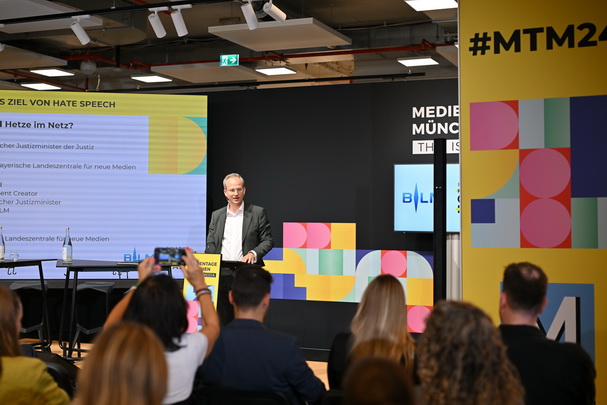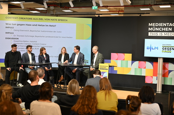 Panel MTM'24, v.li. Jens Taubert, Influencer-Agentur INSIGHT, Content Creator Alessandro Capasso, Stefanie Reger, Pressesprecherin der BLM, HateAid-Geschäftsführerin Josephine Ballon, Justizminister Georg Eisenreich und BLM-Präsident Dr. Thorsten Schmiege